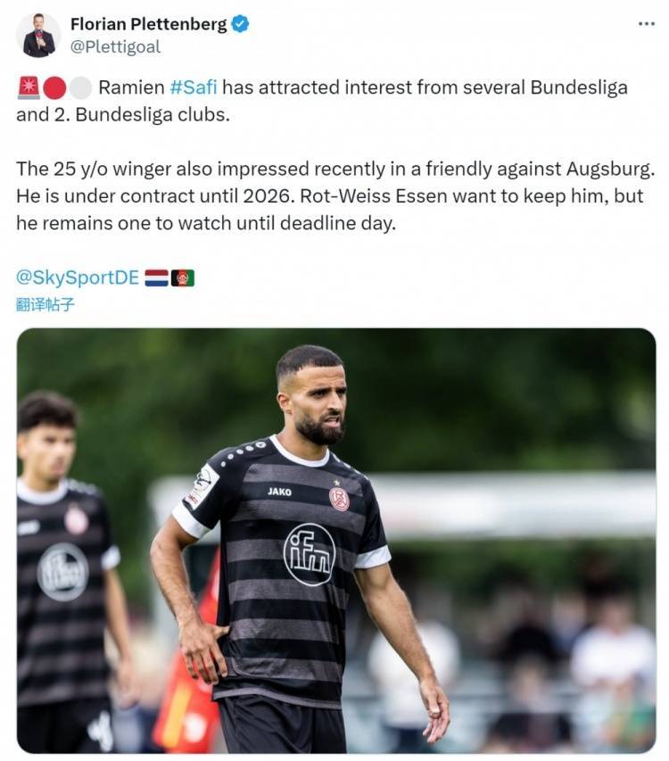 媒体指出,多家德甲、德乙俱乐部对红白埃森边锋萨菲感兴趣,这位25岁的球员在对阵奥格斯堡的友谊赛中表现出色。